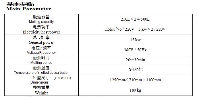 ●RY500F型油脂熔化缸系可可脂等固体状态油脂熔化专用设备之一,可可脂、类可可脂、代可可脂等类型的油脂是巧克力生产的主要原料,在常温下为固体状态,为保证与糖粉、奶粉,可可液块等原料均匀混合磨料的质量,延长精磨设备的使用寿命,固态油脂在进入制浆工序之前融化,是巧克力生产工艺的前期程序。●RY500F型油脂熔化缸,采用双容器夹层导热构造(二种不同性质固态油脂可以同时进行融化)、导热油为热介质、电加热控制系统的特殊设计,符合国际食品卫生标准,上部融化装置由三支特制100mm×100mm不锈钢型材方管呈450倾角构造组成,下部设有保温装置,融化、保温的温度分别在30~150℃之间任意选择控制,本设备具有温度波动范围较小、热值利用率高、使用寿命长、清洁美观等优点。